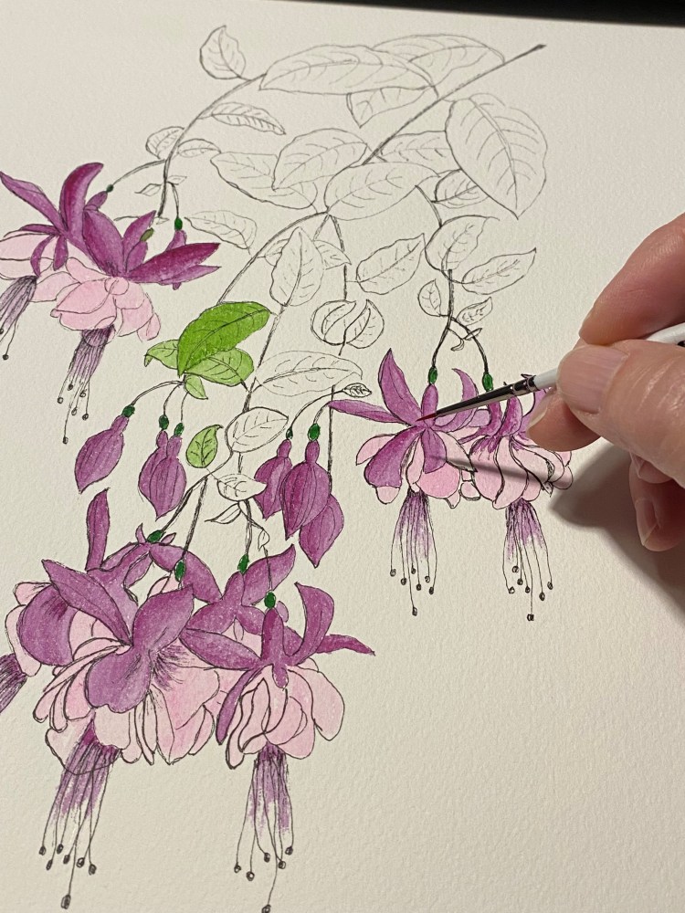 This is my watercolor of the plant Fuchsia. It was hard to decide which wonderful colors to paint the flowers. Fuchsia comes in many colors, but pinks are my favorite. I wanted to capture the delicate and unusual flower that drape from the vine.